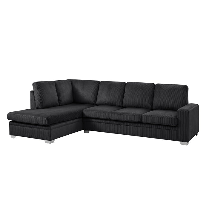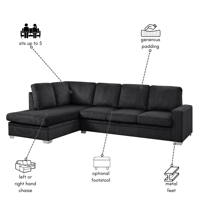 Transform your living space with this contemporary sofa, designed to bring both comfort and style into your home. Upholstered in soft, black jumbo cord, this sofa offers a warm and inviting feel while still being durable enough for everyday use. Seating up to 5 people with the chaise section on the left-hand side (when facing the sofa).