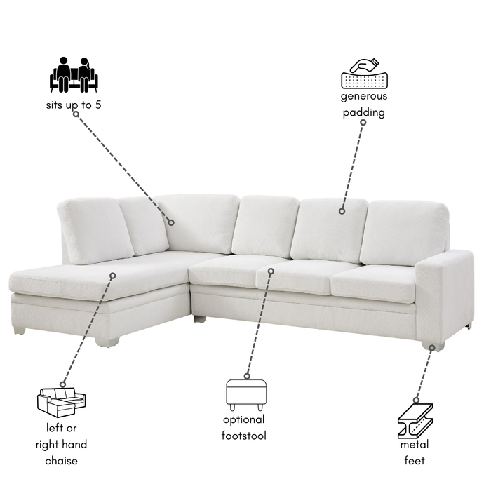 Transform your living space with this contemporary sofa, designed to bring both comfort and style into your home. Upholstered in soft, cream textured linen, this sofa offers a warm and inviting feel while still being durable enough for everyday use. Seating up to 5 people with the chaise section on the left-hand side (when facing the sofa).