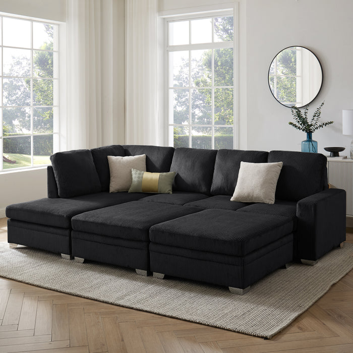 Transform your living space with this contemporary sofa, designed to bring both comfort and style into your home. Upholstered in soft, black jumbo cord, this sofa offers a warm and inviting feel while still being durable enough for everyday use. Seating up to 5 people with the chaise section on the left-hand side (when facing the sofa), it also comes with two matching footstools, transforming your everyday sofa into the ultimate cinema chill-out zone for all the family.