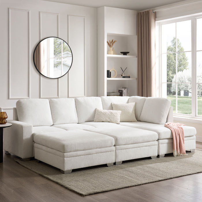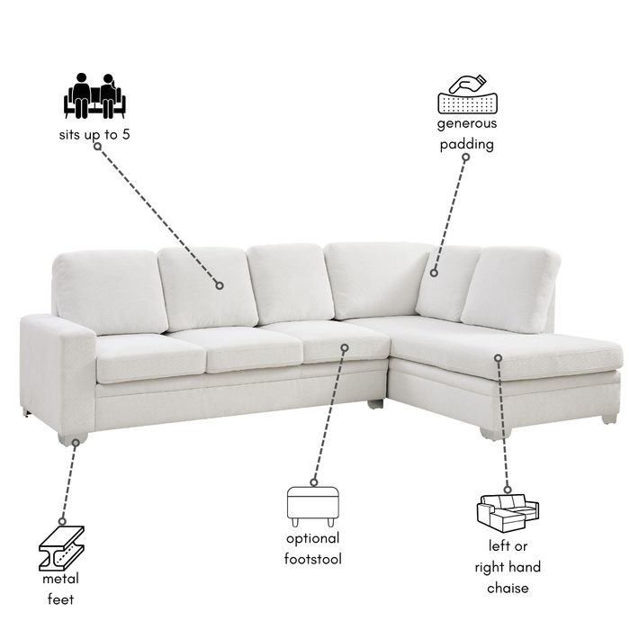 Transform your living space with this contemporary sofa, designed to bring both comfort and style into your home. Upholstered in soft, cream textured linen, this sofa offers a warm and inviting feel while still being durable enough for everyday use. Seating up to 5 people with the chaise section on the right-hand side (when facing the sofa), it also comes with two matching footstools, transforming your everyday sofa into the ultimate cinema chill-out zone for all the family.