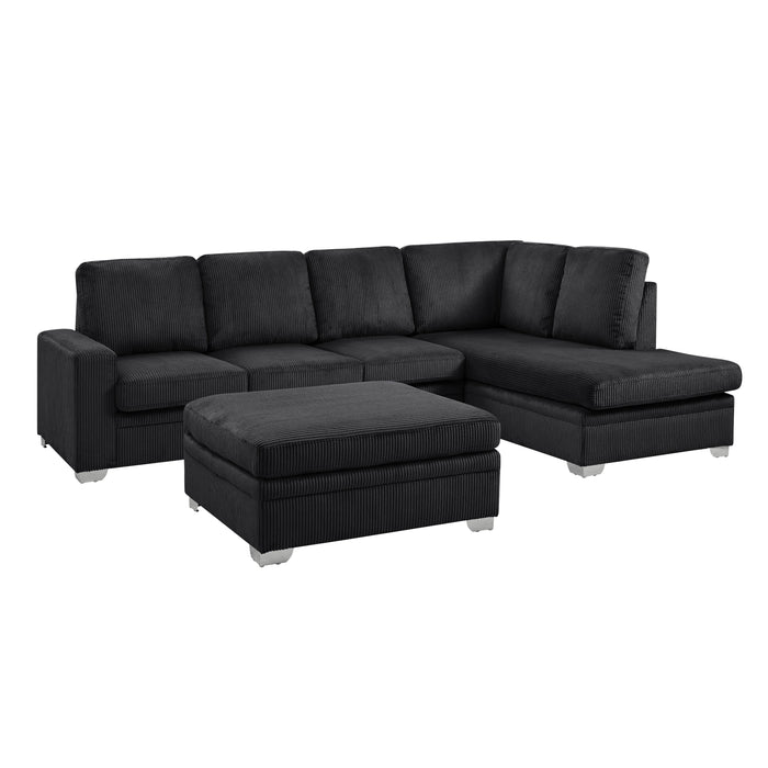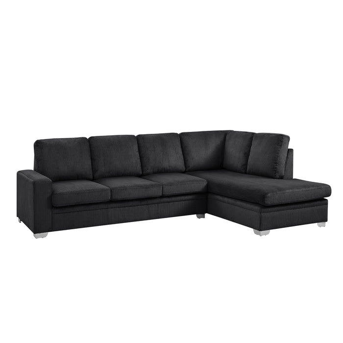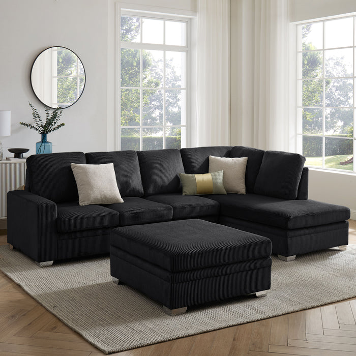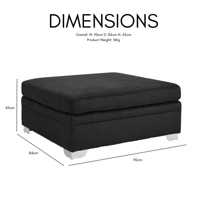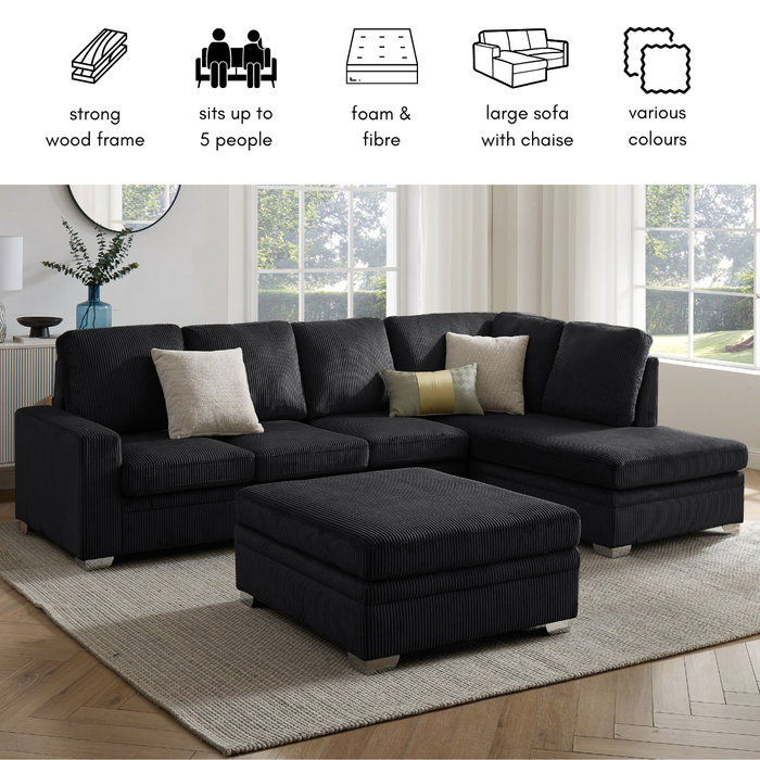 Transform your living space with this contemporary sofa, designed to bring both comfort and style into your home. Upholstered in soft, black jumbo cord, this sofa offers a warm and inviting feel while still being durable enough for everyday use. Seating up to 5 people with the chaise section on the right-hand side (when facing the sofa), it also comes with a matching footstool.