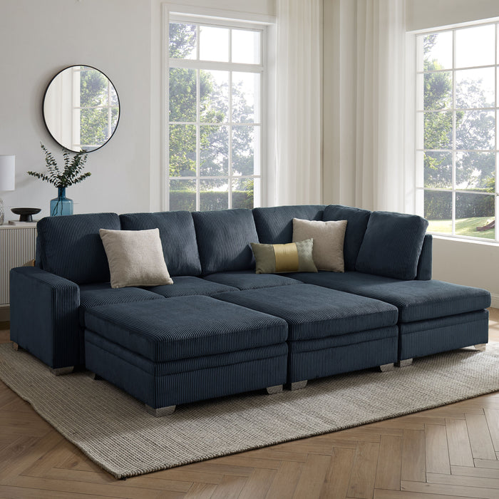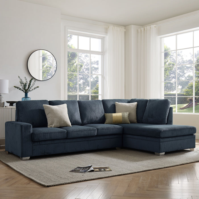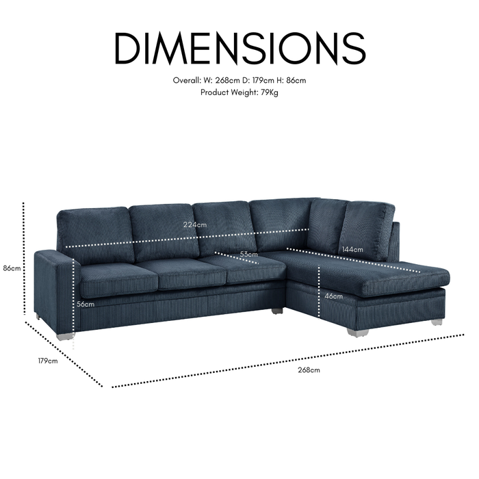 Transform your living space with this contemporary sofa, designed to bring both comfort and style into your home. Upholstered in soft, dark blue jumbo cord, this sofa offers a warm and inviting feel while still being durable enough for everyday use. Seating up to 5 people with the chaise section on the right-hand side (when facing the sofa), it also comes with two matching footstools, transforming your everyday sofa into the ultimate cinema chill-out zone for all the family.