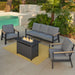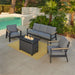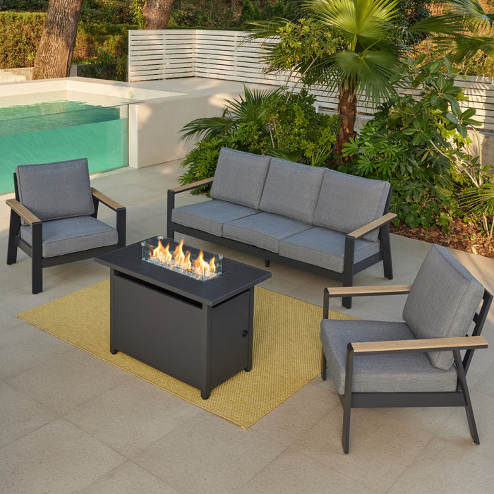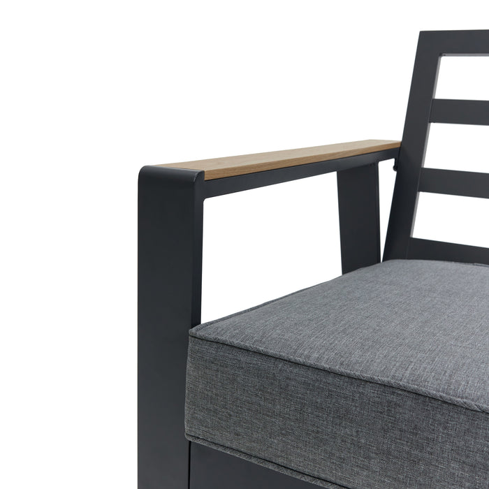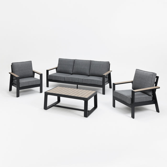 Elevate your outdoor experience further with the inclusion of a chic dark grey aluminium firepit, providing warmth and a captivating focal point for evening gatherings. The grey tones of the cushions and dark grey frame with contrast plastic wooden arms and table top make this outdoor garden sofa set a stunning addition to your patio furniture. Create your own personal retreat with this elegant aluminium lounge set, ideal for enjoying sunny afternoons or starlit evenings.