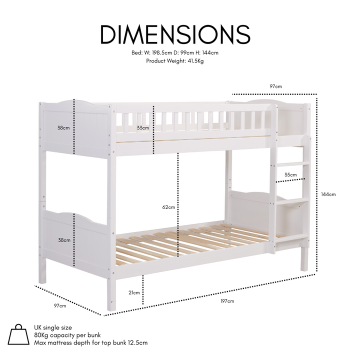 Functional and fun, our Centaurus bunk bed is raised up to offer a handy space saving solution with two single bunk beds. We believe our bunk bed is the perfect choice for bigger families and sleepovers. Painted in non-toxic white paint, we have designed this bunk bed to easily blend with any room style. Safe, versatile and stylish, what more can you want?