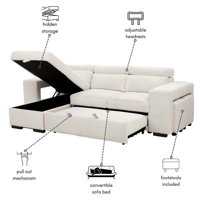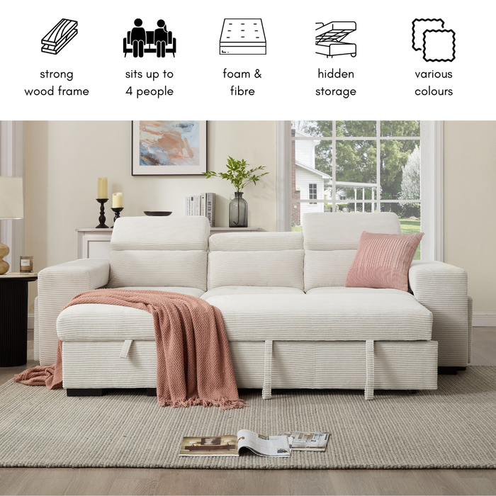 Our designers have ensured you can snuggle up on this sofa for hours, watching your favourite TV shows or spending quality time with your loved ones. With a large seating area that can accommodate up to 4 people, the Caitlin sofa with chaise and pull-out sofa bed is the perfect choice for any family. the chaise, which has a handy storage area under the seat, is reversible and can be placed in either left-hand facing or right-hand facing positions, allowing you to customise your seating area to your specific needs. The standout feature of Caitlin is the pull-out sofa section that instantly creates a small UK double-size bed. So get ready to transform your home into a sanctuary of relaxation and the ultimate chill-out zone for all the family.