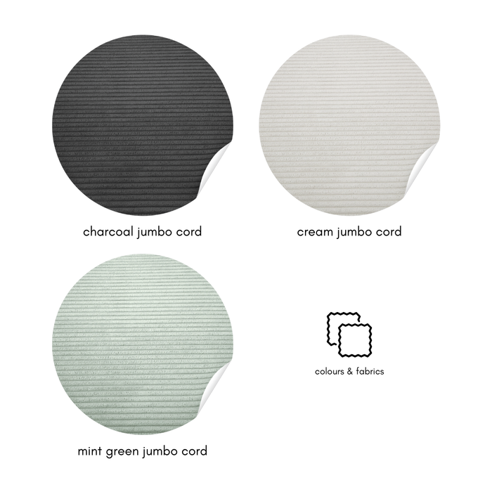 We've carefully selected our favourite jumbo cord fabric that we know you'll adore! cord is a woven material made of polyester. Cord is incredibly warm as it can trap air between its fibres. It is also hardwearing yet soft and durable, it is known for its striped patterning with jumbo cord having a much larger, more pronounced pattern. Go ahead and show off your personality and style by choosing from the stunning cream, charcoal or green jumbo cord fabric options.