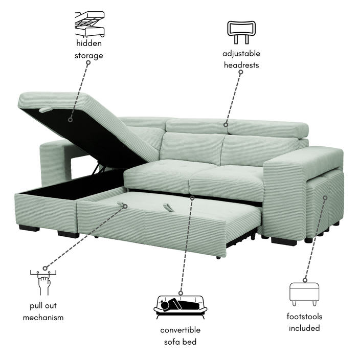 Our designers have ensured you can snuggle up on this sofa for hours, watching your favourite TV shows or spending quality time with your loved ones. With a large seating area that can accommodate up to 4 people, the Caitlin sofa with chaise and pull-out sofa bed is the perfect choice for any family. the chaise, which has a handy storage area under the seat, is reversible and can be placed in either left-hand facing or right-hand facing positions, allowing you to customise your seating area to your specific needs. The standout feature of Caitlin is the pull-out sofa section that instantly creates a small UK double-size bed. So get ready to transform your home into a sanctuary of relaxation and the ultimate chill-out zone for all the family.