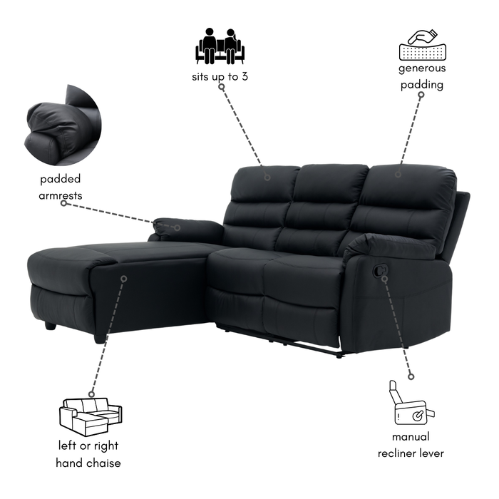 Bring comfort and style into your living room with this sleek, contemporary sofa. Upholstered in smooth black faux leather, this sofa combines a chic modern look with everyday practicality. Seats up to 3 people with the chaise section positioned on the left-hand side (when facing the sofa).