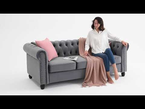 Add some elegance to your home with our gorgeous Chesterfield sofa! With its charming scroll-shaped arms and sophisticated tufted design, this sofa is sure to bring a touch of class to your home. We've handpicked beautiful velvet fabric colours we know you will love! Choose from our lovely shades of grey, blue, green, black, or gold to show off your unique style and personality.
