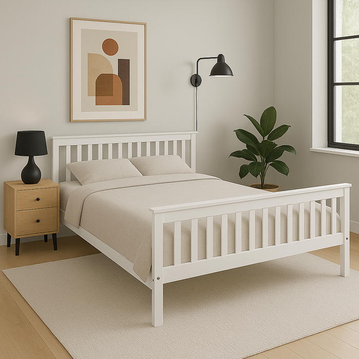 Embrace the beauty in simplicity with our Hampton wooden bed. This bed is more than a piece of furniture: it is a gorgeous shaker style bed frame with clean lines that oozes class and sophistication. With it’s subtle white finish, your bed will seamlessly fit in your bedroom no matter your style! The best part? We have created this bed in single, double or king meaning that no matter your room size, there’s an option for everyone! Whether you want a space saving single bed for a kid’s room or spare room, or a roomy king size bed for star-fishing (or extra room for furry friends!), the Hampton bed is the perfect choice.