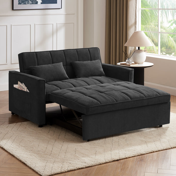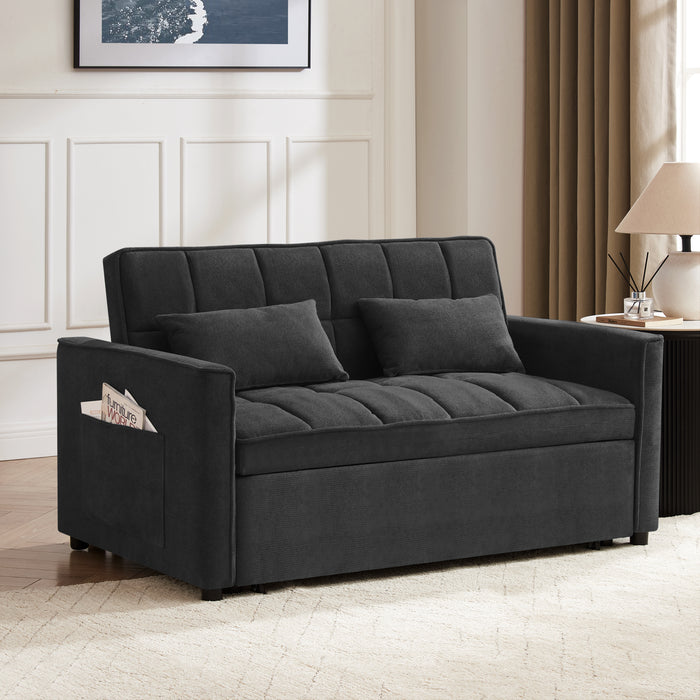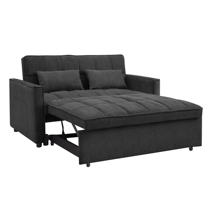 Stylish by day, comfortable by night, Harriet features a generously filled backrest with padded detail and a padded seat. The armrests are boxy, track armrests that boast clean straight lines that grab your attention. The cushions are generously padded, there are storage pockets on either side of the armrests, with 2 matchings scatter cushions that double up as pillows and the frame is supported by black cylindrical wooden feet. The standout feature of Harriet is that it converts to a sofa bed by pulling the tabs and instantly you have a large sofa bed, this sofa bed fully reclines to a flat sleeping area. So get ready to transform your home into a sanctuary of relaxation and the ultimate chill-out zone for all the family.