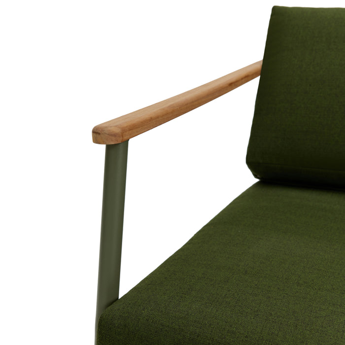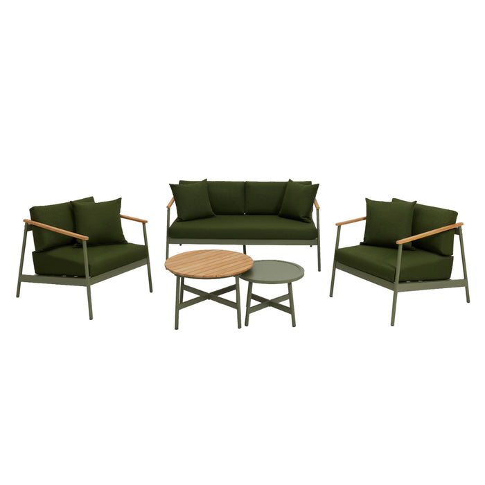 Bring modern sophistication to your outdoor garden area with the stunning Lyon Aluminium Lounge Garden Set. Designed for those who appreciate contemporary style combined with high-quality craftsmanship, this luxury outdoor furniture collection offers a perfect balance of form and function. Built with a sleek, powder-coated soft green aluminium frame and accented with natural teak wood armrests and table top, the Lyon set delivers durability and a modern aesthetic that complements any outdoor setting.