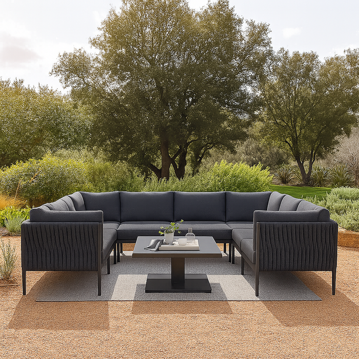 We have hand-picked our favourite on-trend garden furniture colour for Serena, we know you are going to love. With the neutral grey fabric rope contrasting against the sleek aluminium metal frame, Serena is completely versatile and will seamless merge in with any garden style. However, is a beautiful piece in itself. The Serena grey corner set and U-shape garden set also comes with a rising table, so you can change this from a coffee table to a dining table with ease. The lounge set comes with a standard coffee table.