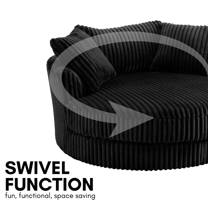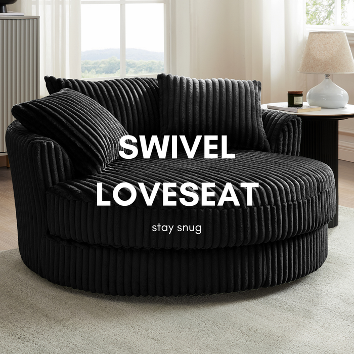 Fancy a cuddle? Our Skyler swivel loveseat is here to give you just that! Experience the ultimate in comfort with our jumbo cord cuddler loveseat. Skyler is an extra-large armchair perfect for 1 person but also generously cosy for 2 people. Relax and unwind, reading your favourite book or binge-watching the latest boxset, the Skyler will very quickly become your favourite spot. Skyler will surely be a statement piece in your living space. With 3 matching throw pillows and 360° swivel, your guests will be fighting over who gets the first shot.