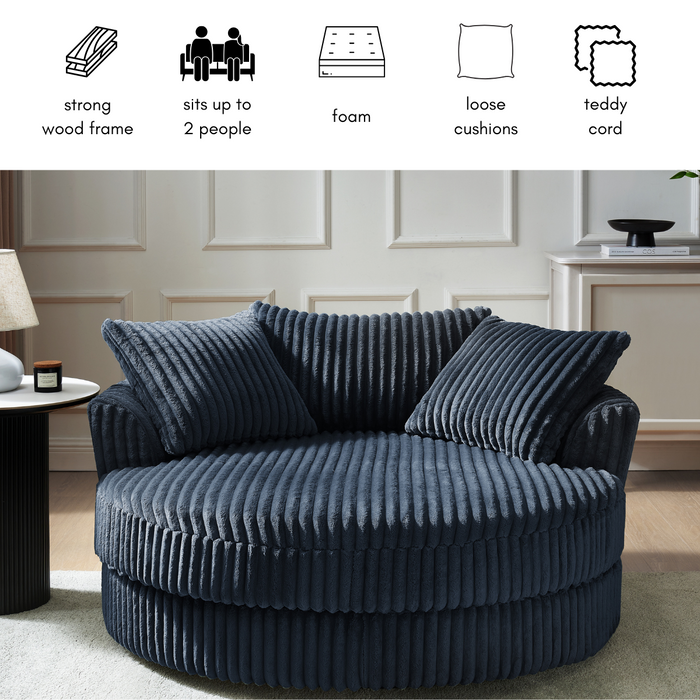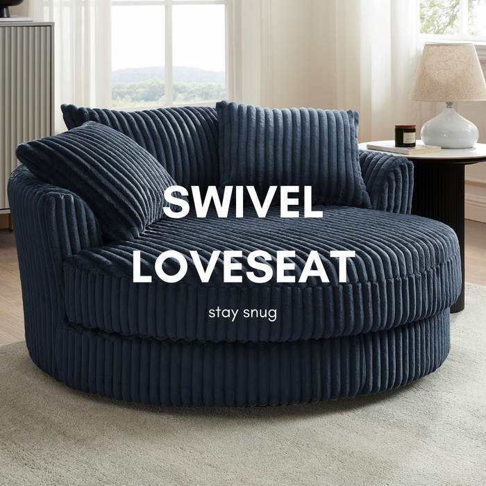 Fancy a cuddle? Our Skyler swivel loveseat is here to give you just that! Experience the ultimate in comfort with our jumbo cord cuddler loveseat. Skyler is an extra-large armchair perfect for 1 person but also generously cosy for 2 people. Relax and unwind, reading your favourite book or binge-watching the latest boxset, the Skyler will very quickly become your favourite spot. Skyler will surely be a statement piece in your living space. With 3 matching throw pillows and 360° swivel, your guests will be fighting over who gets the first shot.