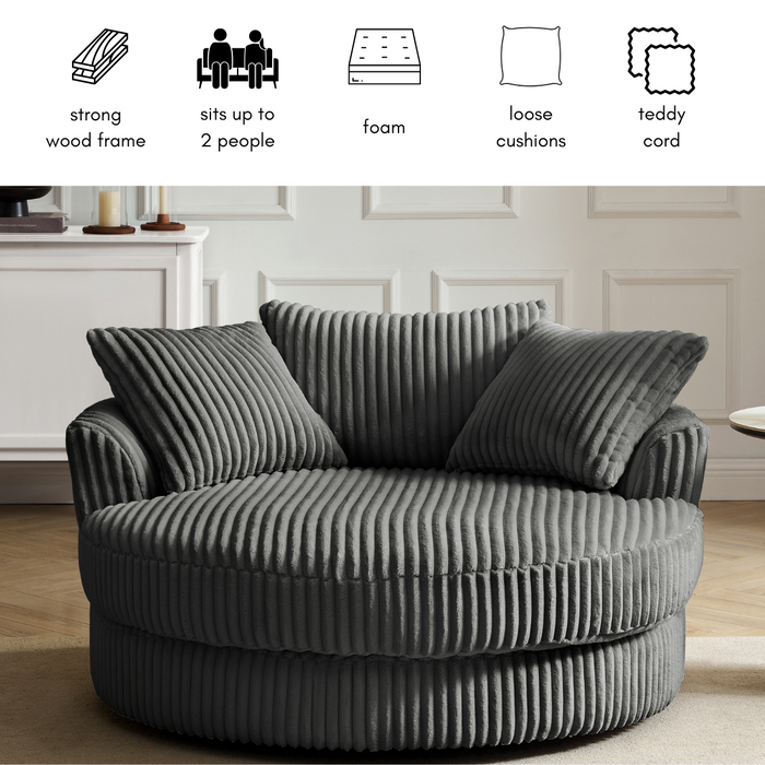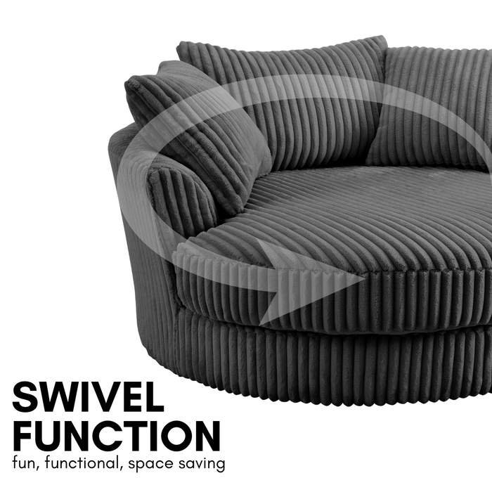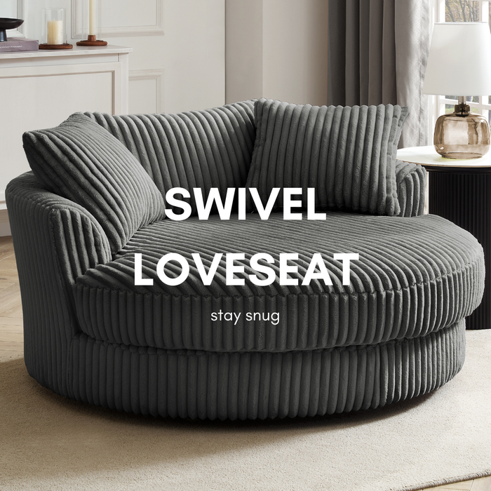 Fancy a cuddle? Our Skyler swivel loveseat is here to give you just that! Experience the ultimate in comfort with our jumbo cord cuddler loveseat. Skyler is an extra-large armchair perfect for 1 person but also generously cosy for 2 people. Relax and unwind, reading your favourite book or binge-watching the latest boxset, the Skyler will very quickly become your favourite spot. Skyler will surely be a statement piece in your living space. With 3 matching throw pillows and 360° swivel, your guests will be fighting over who gets the first shot.